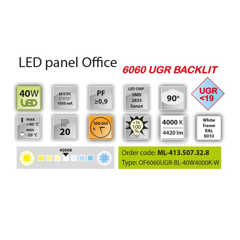 Smart LED panel o výkonu 36 W je moderní a mimořádně úsporné svítidlo, které plně nahrazuje klasické zářivkové řešení 4×18 W a přináší tak úsporu energie až 59 %. Díky možnosti bezdrátového stmívání přes Bluetooth může navíc zákazník ušetřit až dalších 60 % nákladů na osvětlení. Panel vytváří příjemné neutrální bílé světlo 4000 K se silným světelným tokem 3900 lm, takže poskytuje jasné, rovnoměrné a pohodlné osvětlení. Díky mikroprizmatickému difuzoru a nízkému oslnění UGR < 19 je ideální pro kanceláře a další pracovní prostory, kde je kladen důraz na zrakový komfort.